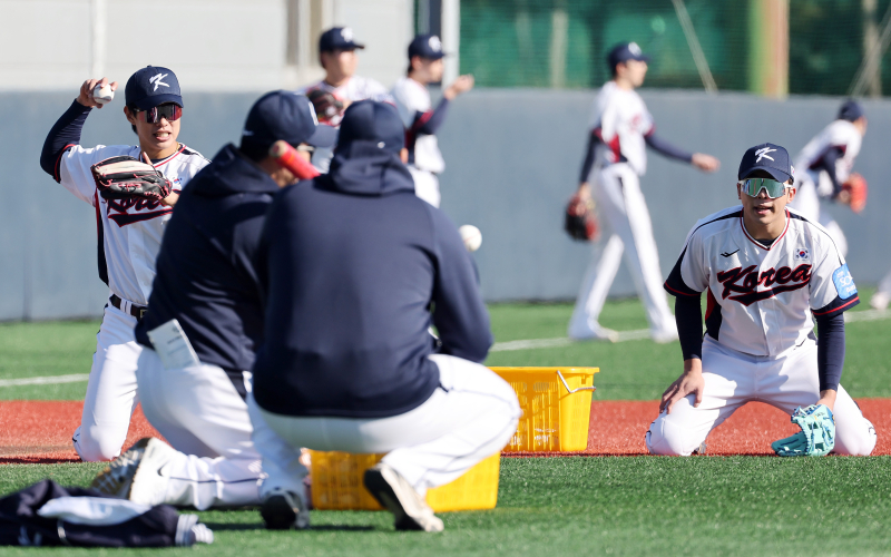 야구 국가대표팀 송성문과 김영웅이 3일 경기 고양 국가대표 야구 훈련장에서 바닥에 무릎을 대고 수비 훈련을 하고 있다. 연합뉴스