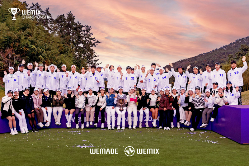 '위믹스 챔피언십 2024' 참가자들이 기념 촬영을 하고 있다. 위메이드 제공 위메이드는 테니스에 이어 골프 대회에도 블록체인 기술을 녹인다. 오는 11월 15일과 16일 경주 마우나오션 C.C에서 KLPGA 투어 슈퍼 파이널 이벤트 '위믹스 챔피언십 2025'를 개최한다.