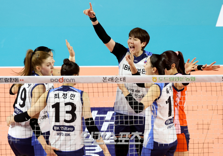 이소영이 25일 오후 인천 삼산월드체육관에서 열린 2024-25 프로배구 V리그 여자부 흥국생명과 IBK기업은행의 경기에서 득점을 올리고 동료들과 함께 기뻐하고 있다. 인천=김민규 기자 /2025.02.25/