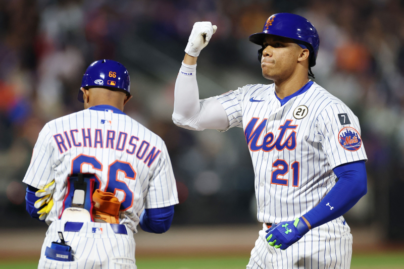 NEW YORK, NEW YORK - SEPTEMBER 16: Juan Soto #22 of the New York Mets reacts after hitting a single during the first inning against the San Diego Padres at Citi Field on September 16, 2025 in the Queens borough of New York City. Sarah Stier/Getty Images/AFP (Photo by Sarah Stier / GETTY IMAGES NORTH AMERICA / Getty Images via AFP)/2025-09-17 09:10:19/ <저작권자 ⓒ 1980-2025 ㈜연합뉴스. 무단 전재 재배포 금지, AI 학습 및 활용 금지>