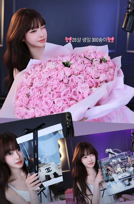 함께 공개된 게시물에 대형 핑크 장미 300송이 꽃다발, 명품 선물 인증샷, 팬들의 응원 메시지가 담겨있다. 웨이브 헤어스타일의 과즙세연은 흰 민소매 상의를 입고 청순함을 자랑했다.