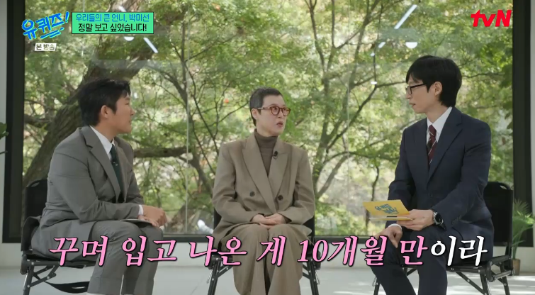 그는 “진짜 오랜만에 보고, 저조차도 지금 화장을 했는데 거울을 보니 낯설더라. 화장을 10개월 만에 한 것이다”라며 “꾸며입고 나온 것도 10개월 만이라 어색하다”고 털어놨다.