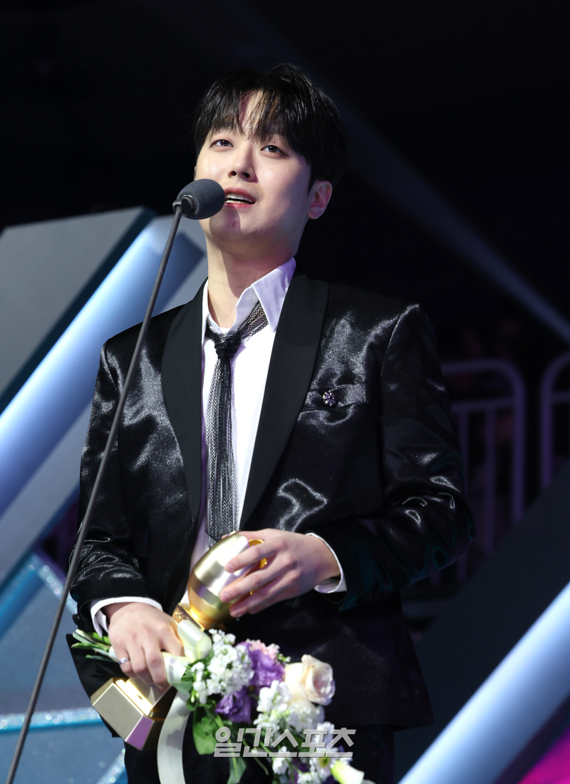 이찬원이 베스트어덜트컨템포러리상을 수상하고 소감을 말하고 있다.