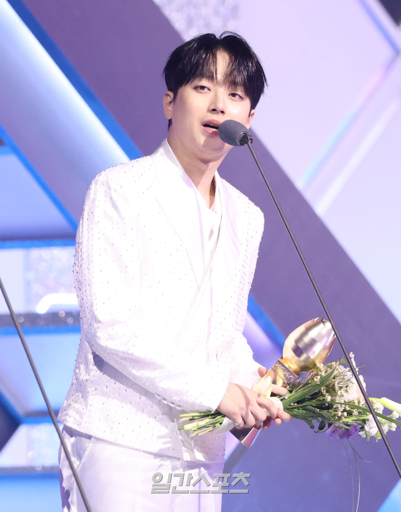 가수 이찬원이 아티스트데이 최고 인기상을 수상하고 소감을 말하고 있다.