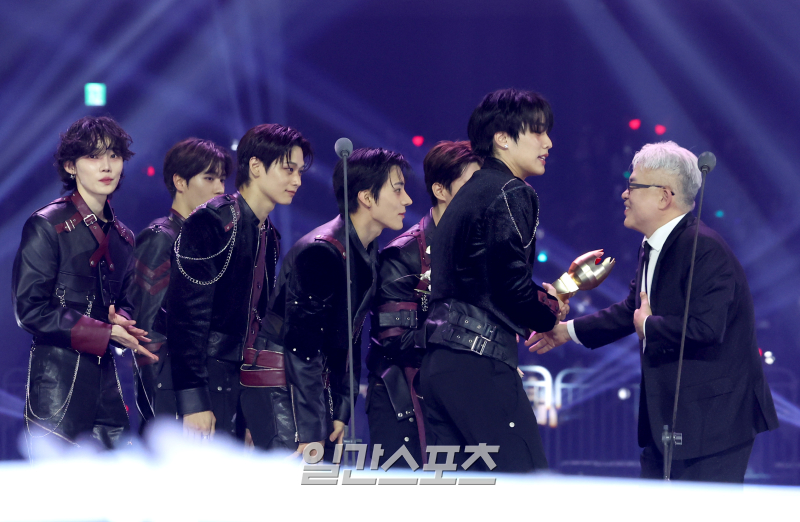 김형석 KGMA심사위원장이 더보이즈에게 그랜드아너스초이스상을 수상하고 있다.