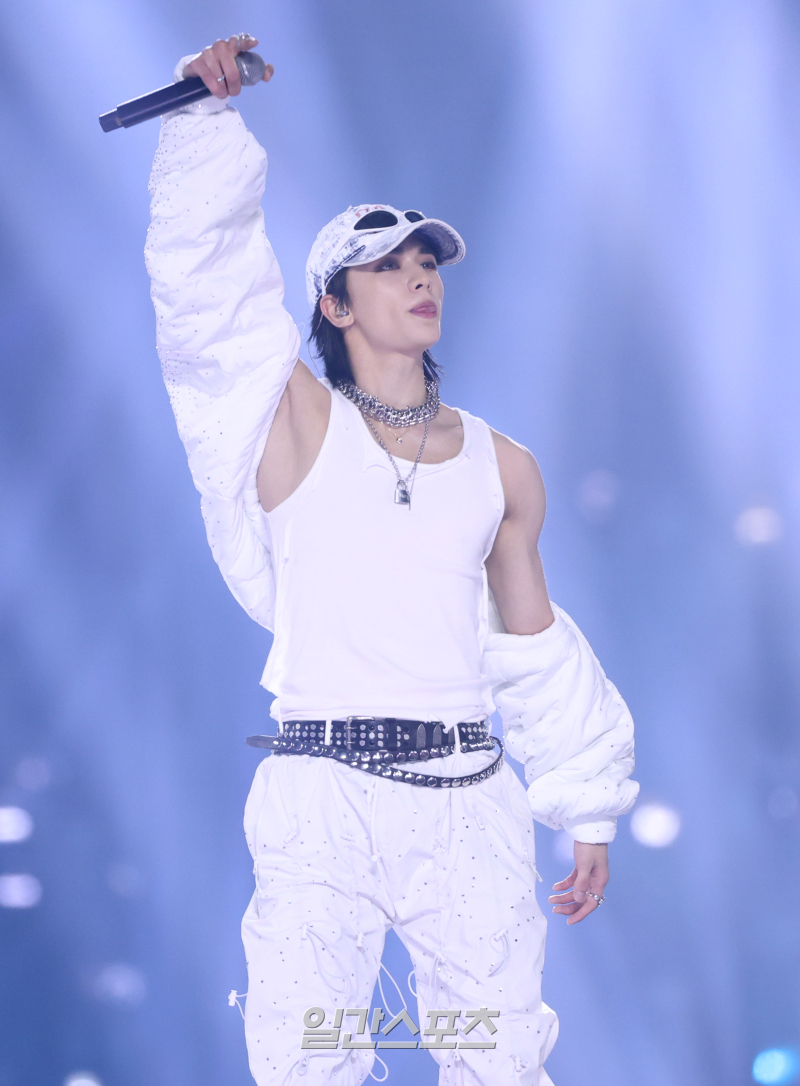 그룹 스트레이 키즈의 현진이 공연을 펼치고 있다.