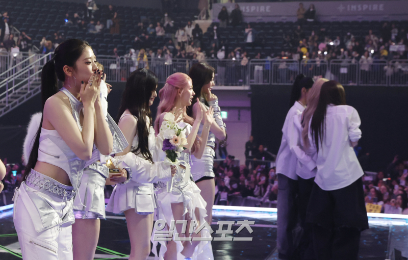 시상식을 마치고 안유진 등 아이브가 팬들에게 인사하고 있다.