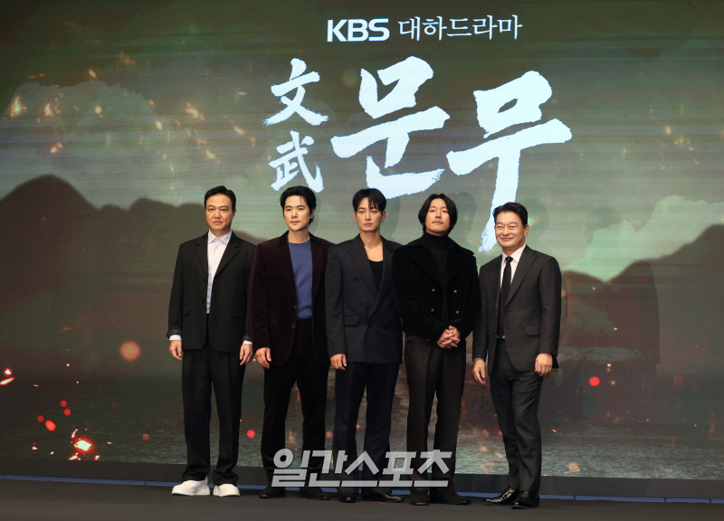 배우 정웅인, 김강우, 이현욱, 장혁, 조성하가 18일 오후 서울 구로구 더세인트에서 열린 KBS 새 대하드라마 '문무' 제작보고회 참석해 포토타임을 갖고 있다. '문무는' 약소국 신라가 고구려, 백제를 넘어 당나라까지 물리치고, 삼국통일을 완성한 위대한 승리의 역사를 조명하는 역사 드라마. 서병수 기자 qudtn@edaily.co.kr /2025.11.18/