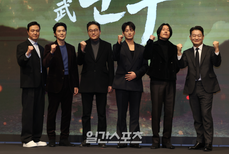 배우 정웅인, 김강우, 김영조 감독, 이현욱, 장혁, 조성하가 18일 오후 서울 구로구 더세인트에서 열린 KBS 새 대하드라마 '문무' 제작보고회 참석해 포토타임을 갖고 있다. '문무는' 약소국 신라가 고구려, 백제를 넘어 당나라까지 물리치고, 삼국통일을 완성한 위대한 승리의 역사를 조명하는 역사 드라마. 서병수 기자 qudtn@edaily.co.kr /2025.11.18/ “막중한 책임감을 느낀다.”