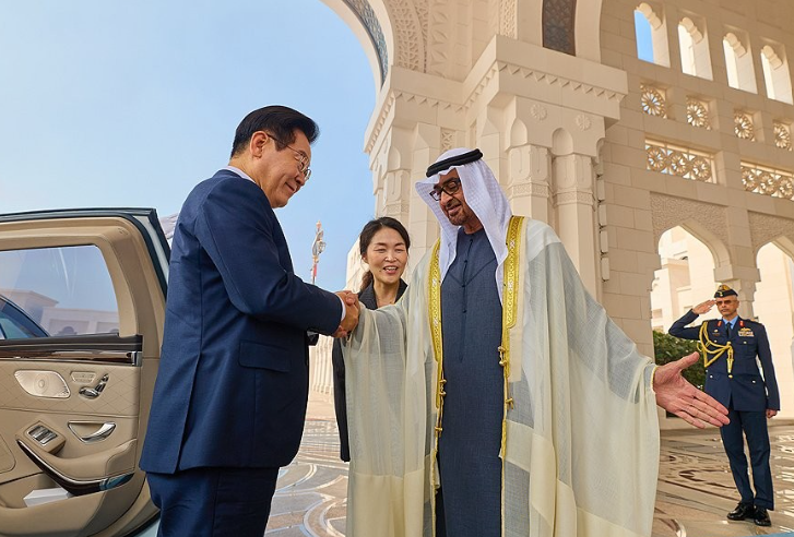 이재명 대통령이 아부다비 대통령궁에서 영접 나온 무함마드 빈 자이드 알 나흐얀 대통령과 인사하고 있다. 연합뉴스