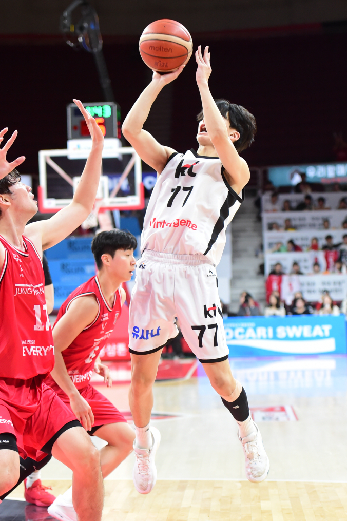 지난 19일 안양실내체육관에서 열린 2025~26 LG전자 프로농구 정규리그 안양 정관장과의 원정 경기에서 슈팅하는 KT 강성욱. KBL 제공