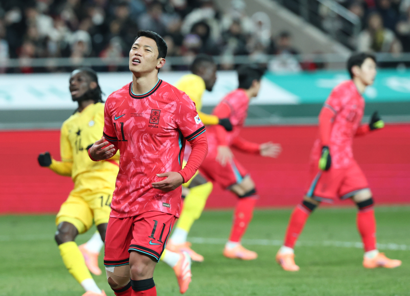 황희찬 득점 실패 (서울=연합뉴스) 신준희 기자 = 18일 서울 마포구 서울월드컵경기장에서 열린 남자축구 국가대표 A매치 평가전 대한민국과 가나의 경기. 한국 황희찬이 페널티킥을 실패한 뒤 아쉬워하고 있다. 2025.11.18 hama@yna.co.kr/2025-11-18 21:35:18/ <저작권자 ⓒ 1980-2025 ㈜연합뉴스. 무단 전재 재배포 금지, AI 학습 및 활용 금지>