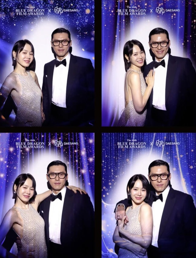 사진 속 두 사람은 시상식에 참석한 모습 그대로 턱시도와 화려한 드레스 차림이다. 특히 현빈은 깔끔한 턱시도에 트렌디한 검은색 안경을 착용하고 있으며, 손예진은 글리터 소재의 우아한 드레스를 입고 사랑스러운 미소를 짓고 있다.