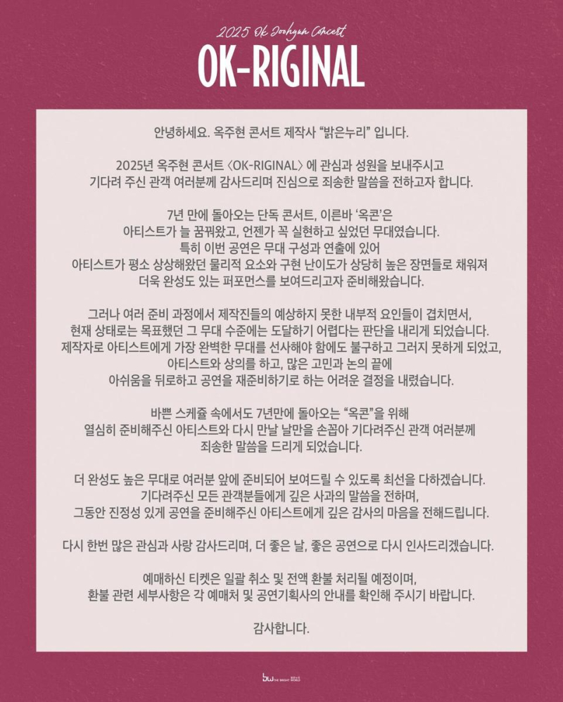 옥주현은 22일 새벽 콘서트 제작사 밝은누리 측의 글을 공유하며 “오래 기다려주신 팬 여러분, 그리고 이번 공연을 기대해 주신 모든 분들께 죄송한 마음”이라고 사과의 뜻을 전했다. 이에 따르면 옥주현의 단독 콘서트가 개최 한 달을 앞두고 공연 재준비를 위해 무기한 연기된다. 제작사 측은 “준비 과정에서 제작진들의 예상하지 못한 내부적 요인들이 겹쳤고 현재 상태로는 목표했던 무대 수준에 도달하기 어렵다는 판단을 내렸다”고 설명했다.