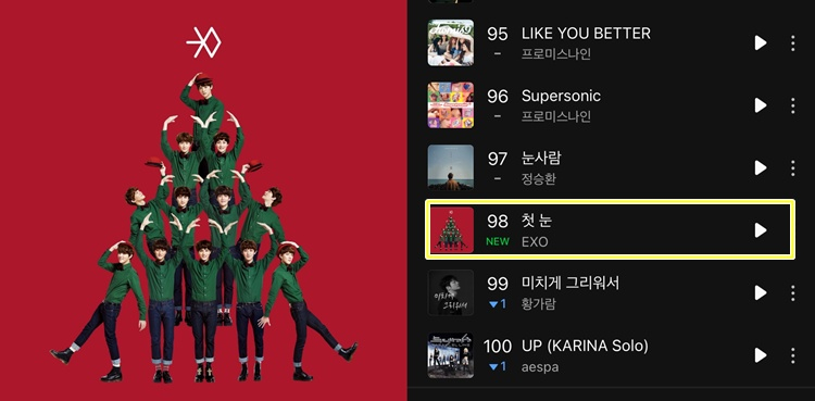 23일 기준 엑소의 ‘첫 눈’이 멜론 일간차트 98위로 새롭게 진입했다. ‘첫 눈’은 2013년 12월 엑소의 겨울 스페셜 앨범 ‘12월의 기적’으로 발매된 노래다.