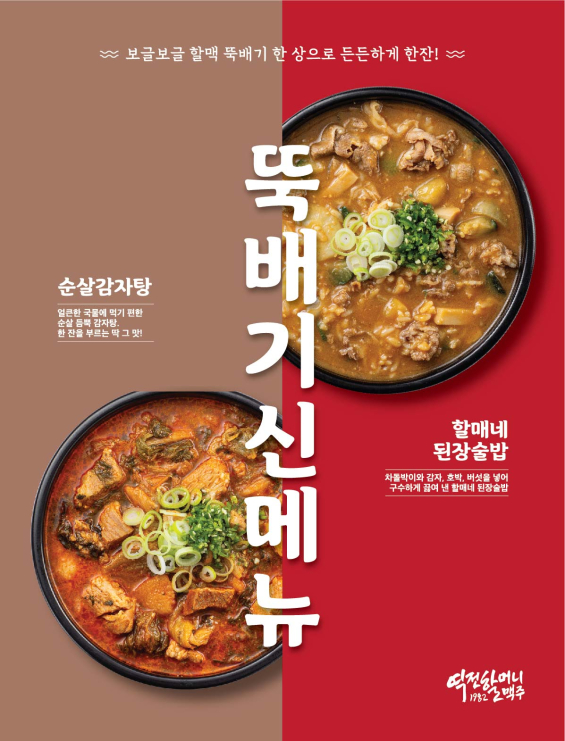 이번에 선보이는 메뉴는 △얼큰한 국물에 순살 고기가 듬뿍 얹어진 ‘순살감자탕’과 △차돌박이·감자·호박·버섯을 넣어 구수하게 끓여낸 ‘할매네된장술밥’ 두 가지다.
