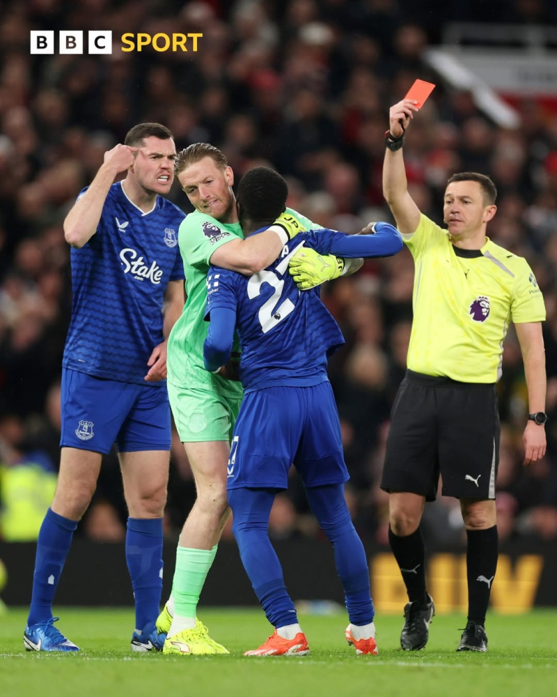 영국 매체 BBC는 25일(한국시간) 맨체스터 유나이티드와 에버턴의 2025~26 EPL 12라운드 경기 중 벌어진 동료 간 충돌 사건을 조명했다. 상황은 이렇다. 이날 에버턴 미드필더 이드리사 게예는 전반 13분 레드카드를 받았다. 상대 선수에게 거친 플레이를 범한 게 아니라, 팀 동료 마이클 킨과 말다툼을 하다 왼손으로 그의 얼굴을 가격했다. 해당 장면을 목격한 주심은 게예에게 레드카드를 꺼냈다.