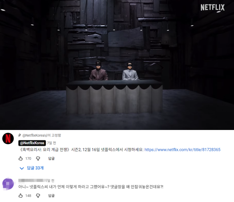 그러나 넷플릭스 측은 티저 예고편을 공개하며 그대로 댓글 창을 누리꾼의 몫으로 열어두었다. 티저 영상에도 백종원이 심사위원으로 출연해 안대로 눈을 가리고 블라인드 심사를 하는 모습 등이 작게 모습을 비췄다. 이에 해당 영상엔 이날까지 2,535개 이상의 댓글이 작성됐다.