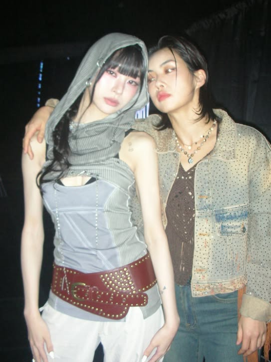 사진 속 노제는 회색 후드가 달린 민소매 상의와 와이드 팬츠를 입고 파격적인 스타일링을 선보였다. 특히 두꺼운 가죽 벨트와 체인 액세서리, 그리고 독특한 후드를 뒤집어 쓰고 강렬한 스트릿 패션을 완성했다. 사진=노제 SNS 특히 풀뱅 앞머리에 속눈썹을 강조한 강렬한 언더 아이 메이크업은 카리스마를 배가시키는 한편, 에스파 멤버 카리나를 닮았다는 누리꾼 반응을 자아내며 화제를 모으고 있다.