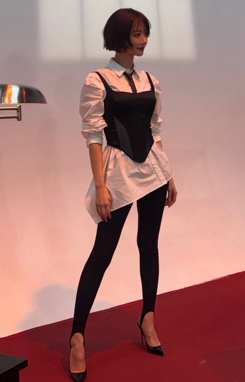 특히 일자처럼 곧게 떨어지는 극세사 롱다리와 완벽하게 잘린 칼단발 스타일이 조화를 이루며 무대 조명 아래서도 흔들림 없는 존재감을 발산한다.
