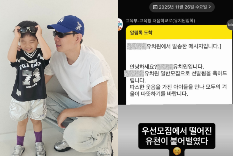 앞서 제이쓴은 지난 10일 해당 유치원의 우선모집 탈락 결과를 받고 “환장”이라는 짧은 메시지와 함께 캡처 화면을 공개해 학부형 누리꾼들의 공감을 받았다. 그후로부터 보름 만에 일반모집에서 합격하자 제이쓴은 ‘입틀막’ 이모티콘을 덧붙여 감격을 드러냈다.