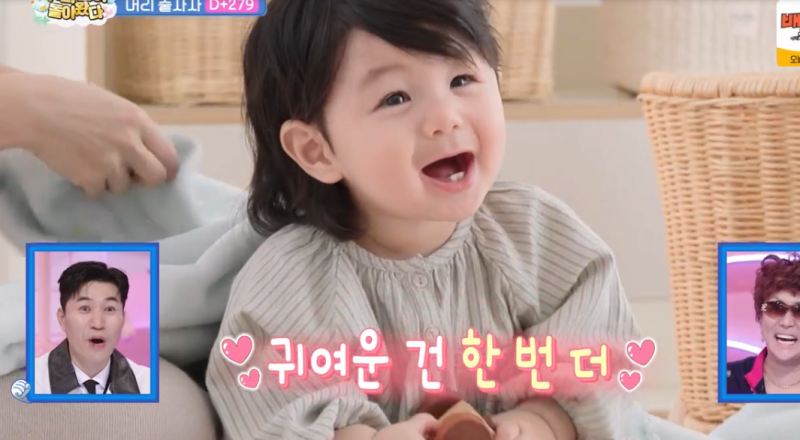 9개월임에도 헤어 스타일리스트가 따라붙는 모습에 심형탁이 “저런 경우가 있냐”고 물었고, 스태프는 “처음인 것 같다”고 답했다. 사진= KBS2 캡처사진= KBS2 캡처 심형탁의 열성적인 관심 끌기에 하루는 카메라를 향해 천사 미소와 함께 옹알이를 발사했다. 랄랄은 “9개월인데 김종민보다 말을 잘하는 것 같다”고 너스레를 떨었다.