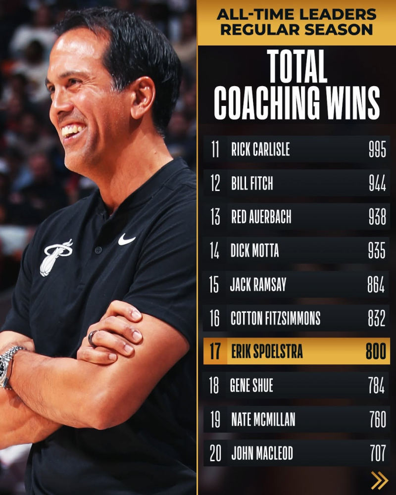 지난 2008년부터 마이애미를 이끈 스포엘스트라 감독은 이날 승리로 의미 있는 이정표를 세웠다. 밀워키전 승리로 정규리그 800승(578패) 고지를 밟은 역대 17번째 감독이 됐다.