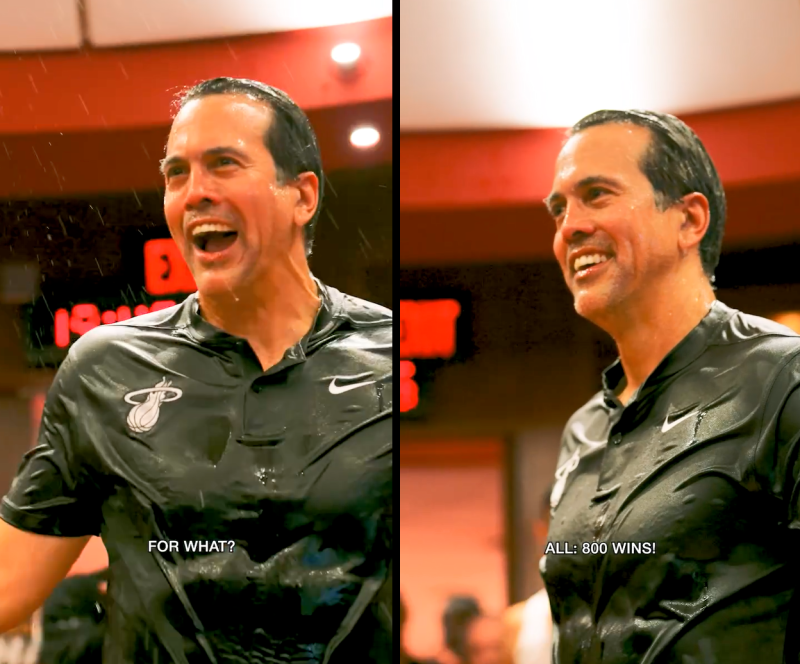 에릭 스포엘스트라 마이애미 히트 감독이 개인 통산 800승을 거둔 뒤 선수들로부터 기분 좋은 물세례를 맞았다. 정작 감독 본인은 800승 달성 여부를 인지하지 못했던 거로 알려졌다.