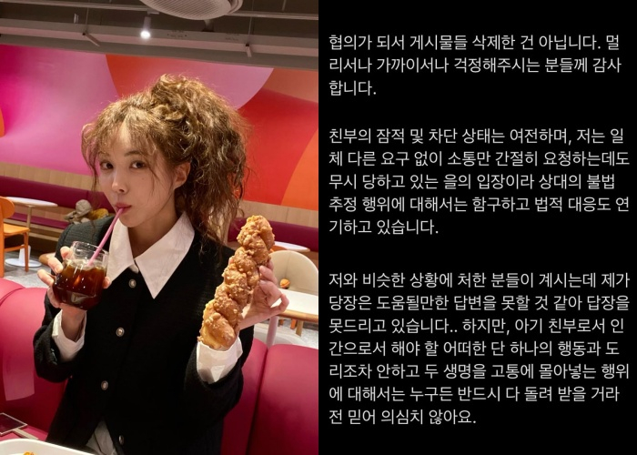 아울러 “서민재의 주장과 달리 A씨는 잠적한 사실이 없으며, 아이에 대해서도 법적 책임을 다하겠다는 입장을 일관되게 밝혀왔다”며 “(A씨가) 일상생활이 어려울 정도의 정신적·사회적 피해를 겪고 있다. 허위 게시물에 대한 게시금지가처분신청과 손해배상청구 등 가능한 모든 법적 조치를 즉각 취할 것”이라고 경고했다.