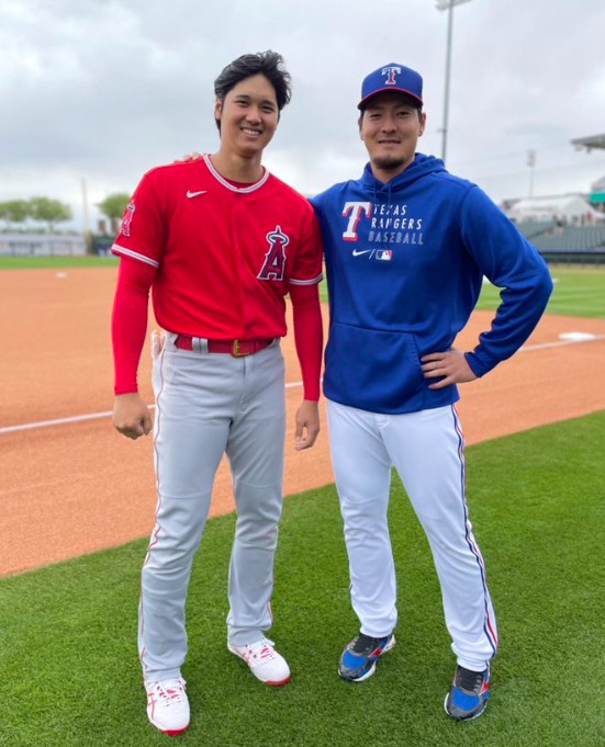 2021년 텍사스 시절의 아리하라. 오른쪽은 당시 LA 에인절스에서 뛰던 오타니 쇼헤이. @aripay_35 캡처