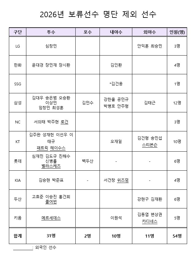 KBO에 따르면 올 시즌 KBO리그에 등록된 선수는 총 597명이며 정규시즌 중 자유계약선수 및 임의해지, 군보류 선수, 미계약 자유계약선수(FA), 보류제외 선수 등 총 29명이 제외돼 최종 568명이 2026년도 보류선수로 공시됐다.
