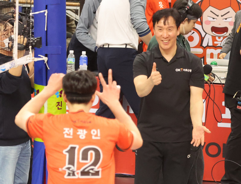 지난 27일 부산 강서체육관에서 열린 프로배구 V리그 남자부 OK저축은행에서 승리한 통산 300승을 이룬 신영철 감독이 승리가 결정되자 전광인에게 '엄지척'을 보이는 모습. 연합뉴스 이날 승리로 시즌 5승(6패)째를 수확하고 승점 15가 된 OK저축은행은 한국전력(5승 5패, 승점 14)을 제치고 리그 4위가 됐다. 2연패를 당한 우리카드는 6위(4승 7패, 승점 12)에 머물렀다.