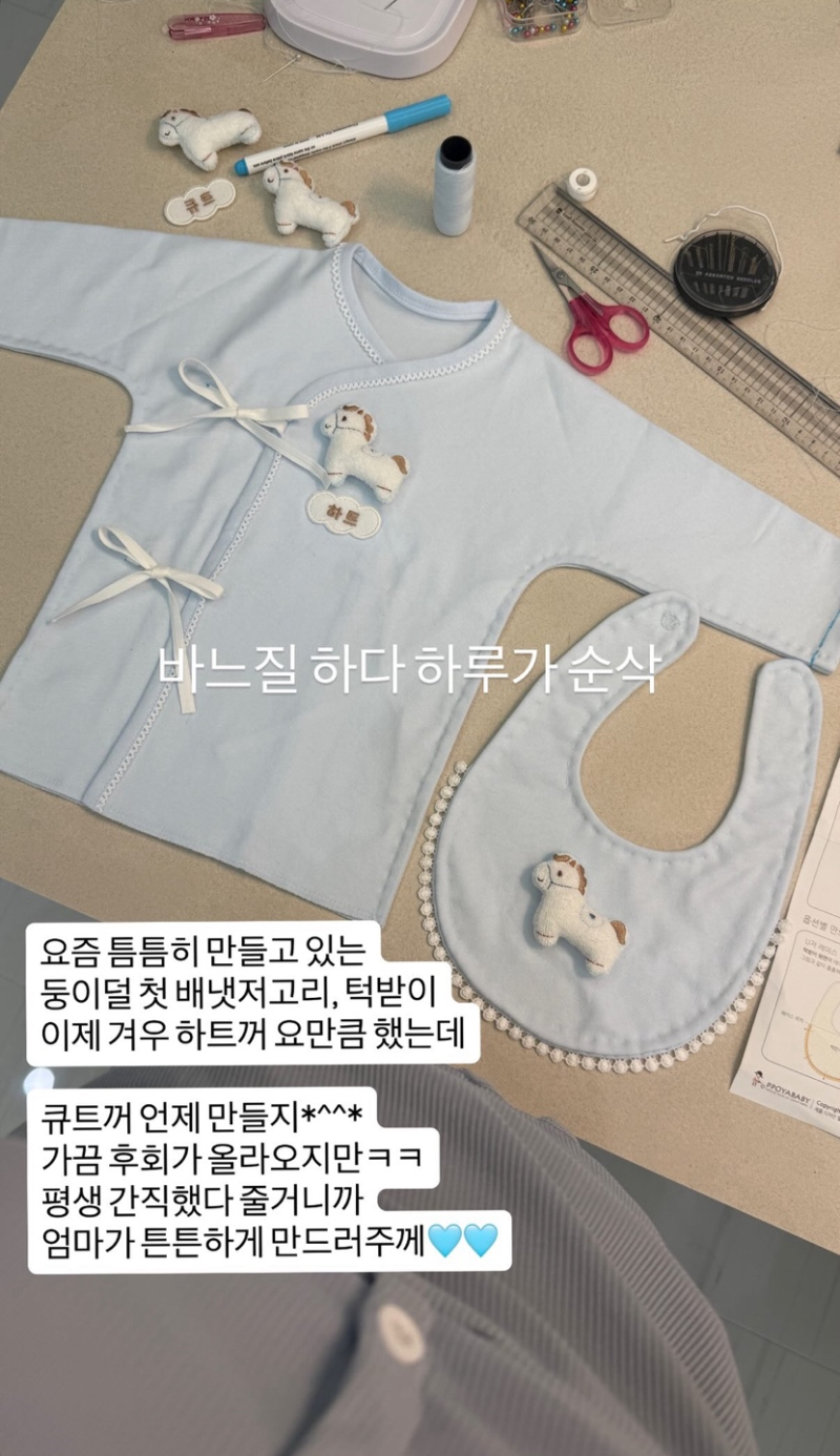 초아는 11월 30일 자신의 SNS에 “바느질 하다 하루가 순삭”이라며 직접 만든 배냇저고리와 턱받이 사진을 공개했다. 그는 “엄마가 튼튼하게 만들어 줄게”라며 곧 태어날 아이에게 애정을 드러냈다.