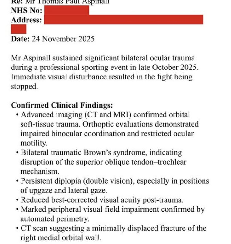 MMA 파이팅은 “병력에는 아스피날이 심각한 양 측 눈 외상을 당했다고 명시돼 있다”며 “클리블랜드 클리닉에 따르면, 아스피날의 부상은 브라운 증후군과 같은 징후를 보인다고 밝혔다”고 짚었다.