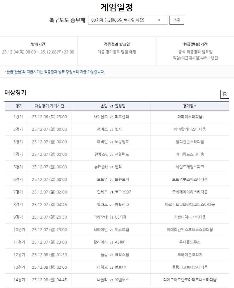 한편, 오는 12월 4일(목) 오전 8시부터 참여할 수 있는 축구토토 승무패 80회차는 EPL 및 세리에A 주요 빅매치들이 대거 포함됐다. 이번 회차에는 ▲본머스–첼시(2경기) ▲맨시티–선덜랜드(4경기) ▲토트넘–브렌트퍼드(6경기) ▲인테르–코모1907(7경기) ▲칼리아리–AS로마(11경기) ▲라치오–볼로냐(13경기) ▲나폴리–유벤투스(14경기) 등이 선정됐다.