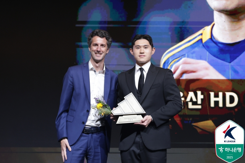 울산 이동경(오른쪽)이 1일 서울 서대문구 스위스그랜드호텔에서 열린 하나은행 K리그 2025 대상 시상식 중 K리그1 MVP 부문 수상자로 선정돼 기념 촬영을 하고 있다. 사진=프로축구연맹