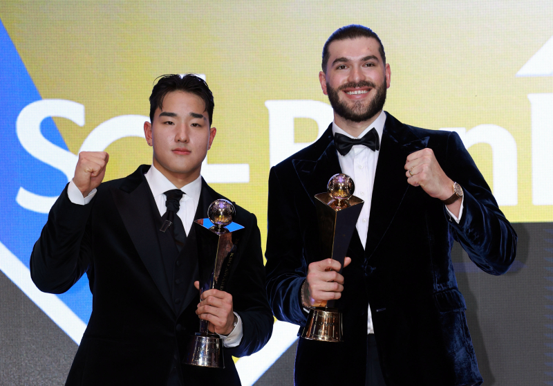 2025 KBO 시상식 MVP와 신인상 수상자 (서울=연합뉴스) 한종찬 기자 = 24일 서울 송파구 롯데호텔 월드에서 열린 2025 신한 SOL뱅크 KBO 시상식에서 정규시즌 최우수선수(MVP)로 선정된 한화의 폰세와 신인상을 수상한 KT의 안현민이 트로피와 함께 기념촬영을 하고 있다. 2025.11.24 saba@yna.co.kr/2025-11-24 15:43:02/ <저작권자 ⓒ 1980-2025 ㈜연합뉴스. 무단 전재 재배포 금지, AI 학습 및 활용 금지> 단 하나의 시상식, 단 하루의 축제가 개막한다.