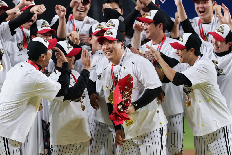 31일 대전한화생명볼파크에서 열린 2025 프로야구 KBO리그 포스트시즌 한국시리즈 시상식에서 통합 우승을 차지한 LG 트윈스 김현수가 한국시리즈 MVP를 수상한 뒤 동료들의 축하를 받고 있다. 김현수는 5경기 17타수 9안타, 타율 0.529에 홈런 1개, 8타점으로 맹활약하며 팀 우승을 이끌었다. [연합뉴스]
