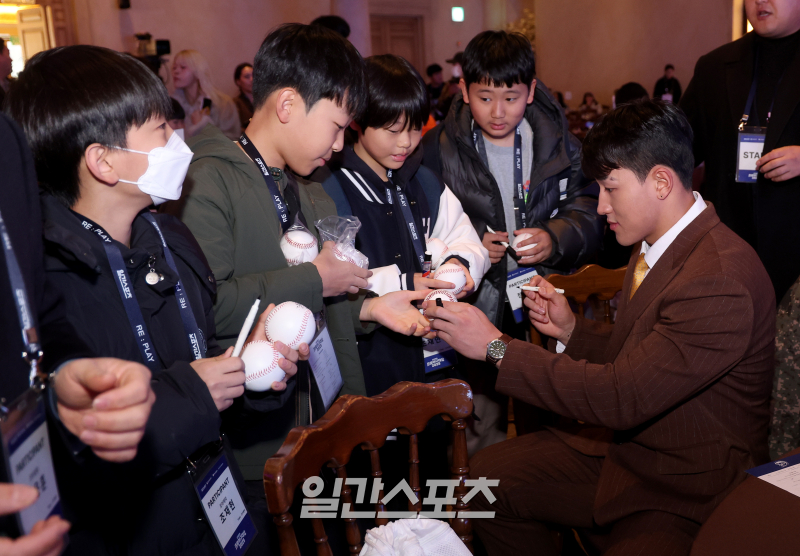 시상식 전 KT 안현민이 어린이팬에게 사인을 해주고 있다.
