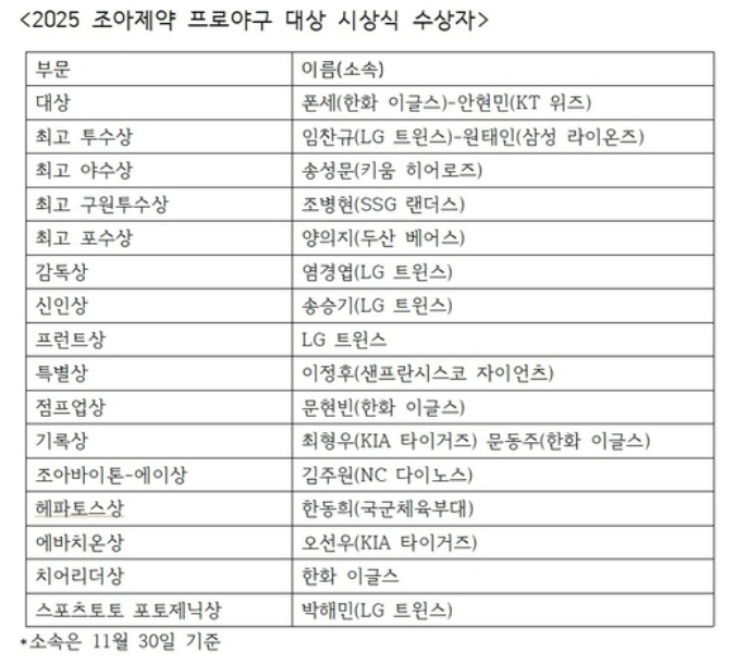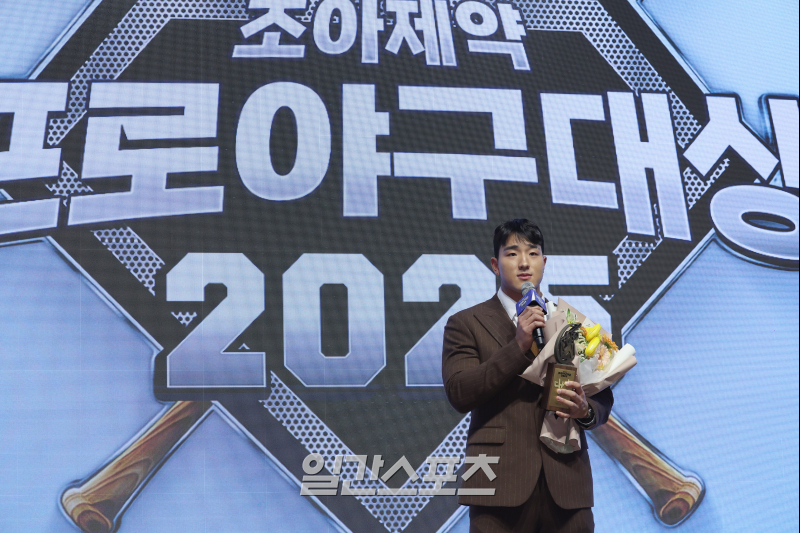 (주)조아제약과 일간스포츠가 공동제정한 '2025 조아제약 프로야구 대상' 시상식이 2일 오전 서울 강남구 라움아트센터에서 열렸다. LG 임찬규가 최고투수상을 수상하고 소감을 말하고 있다. 국내 최고의 권위를 자랑하는 일간스포츠-조아제약 프로야구 대상은 1977년 출범 이후 48년의 역사를 이어온 명실상부 국내 최고의 프로야구 시상식이다. 올해 시상식은 전통 시상식의 틀을 뛰어넘어, 팬들이 참여하는 토크쇼, 특별사인회 등 다채로운 행사로 거듭났다. 특별취재단/2025.12.02/(주)조아제약과 일간스포츠가 공동제정한 '2025 조아제약 프로야구 대상' 시상식이 2일 오전 서울 강남구 라움아트센터에서 열렸다. 삼성 원태인이 최고투수상을 수상하고 소감을 말하고 있다. 국내 최고의 권위를 자랑하는 일간스포츠-조아제약 프로야구 대상은 1977년 출범 이후 48년의 역사를 이어온 명실상부 국내 최고의 프로야구 시상식이다. 올해 시상식은 전통 시상식의 틀을 뛰어넘어, 팬들이 참여하는 토크쇼, 특별사인회 등 다채로운 행사로 거듭났다. 특별취재단/2025.12.02/ 뒷문을 단단히 걸어 잠근 조병현(SSG 랜더스)은 최고 구원투수상을, 안방마님 양의지(두산 베어스)는 최고 포수상을 받으며 변함없는 클래스를 입증했다.