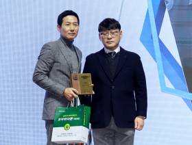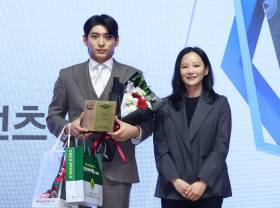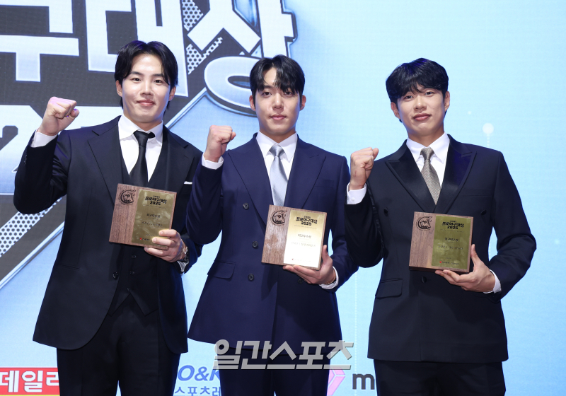 [포토]최고투수상 임찬규·원태인과 최고야수상 송성문, 트로피 들고