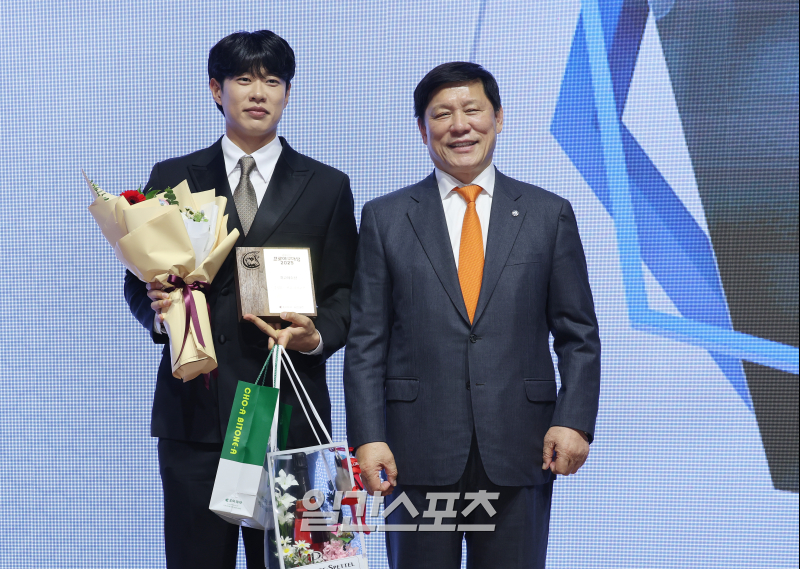 키움 송성문이 최고 야수상을 수상한 후 시상자인 허구연 KBO총재와 함께 포즈를 취하고 있다.