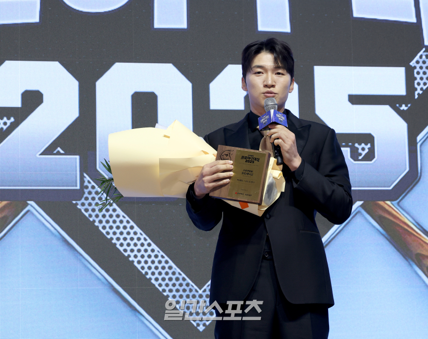 (주)조아제약과 일간스포츠가 공동제정한 '2025 조아제약 프로야구 대상' 시상식이 2일 오전 서울 강남구 라움아트센터에서 열렸다. 오선우가 에바치온상을 수상하고 소감을 말하고 있다. 국내 최고의 권위를 자랑하는 일간스포츠-조아제약 프로야구 대상은 1977년 출범 이후 48년의 역사를 이어온 명실상부 국내 최고의 프로야구 시상식이다. 올해 시상식은 전통 시상식의 틀을 뛰어넘어, 팬들이 참여하는 토크쇼, 특별사인회 등 다채로운 행사로 거듭났다. 특별취재단/2025.12.02/