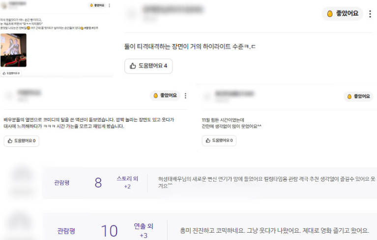 또한, 배우들의 상상 그 이상의 케미스트리와 연기 변신에 대한 호평도 쏟아지고 있다. “허성태 배우님의 새로운 변신 연기가 맘에 들었어요. 킬링타임용 관람 적극 추천 생각 없이 즐길 수 있어요”(메가박스, Sa****), “배우분들의 열연으로 코미디의 탈을 쓴 액션이 돋보였습니다. 깜짝 놀라는 장면도 있고 웃다가 대사에 느끼해하다가 ㅋㅋㅋ 시간 가는 줄 모르고 재밌게 봤습니다”(CGV, 까칠한****), “둘이 티격태격하는 장면이 거의 하이라이트”(CGV, 완벽한****)라며 상극 콤비 시너지에 극찬을 보냈다.