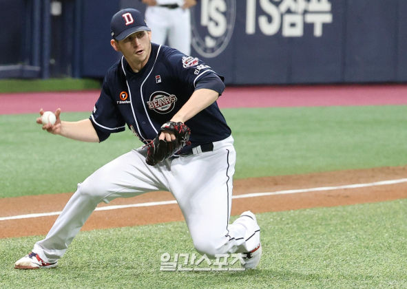 프로야구 2020 KBO한국시리즈 NC 다이노스와 두산 베어스의 5차전이 23일 오후 서울 고척스카이돔에서 열렸다. 3회말 무사 박석민의 땅볼타구를 플렉센이 주저앉으며 잡아내 일어서며 1루로 송구, 아웃시키고 있다. 고척=김민규 기자