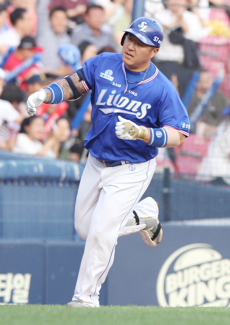 2016 타이어뱅크 KBO리그 프로야구 삼성라이온즈-LG 트윈스 전이 8일 잠실야구장에서 진행됐다. 삼성 최형우가 2회초 무사 때 우익수 뒤로 솔로포를 터뜨리고 그라운드를 돌고 있다.
