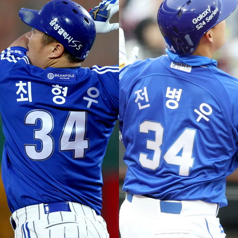 2016년까지 삼성에서 34번을 달고 뛰었던 최형우와 현재 34번의 주인인 전병우. 사진=삼성 제공
