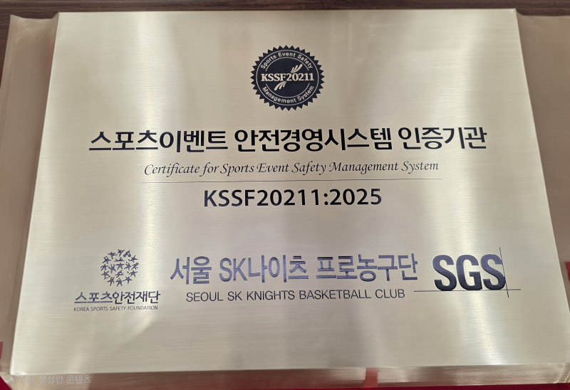 서울 SK는 지난 3일 올림픽 파크텔에서 열린 스포츠 안전재단 주최 2025년 스포츠안전경영 인증 수여식에서 프로농구단 최초로 스포츠 이벤트 안전경영 시스템(KSSF20211)을 인증 받았다.