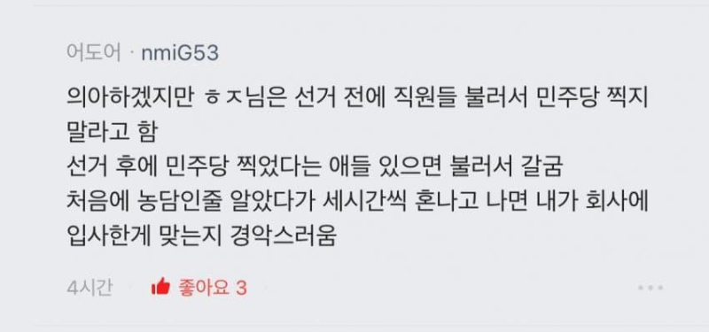 지난 2024년 온라인 커뮤니티 블라인드에는 민 전 대표가 직원들을 불러 특정 정당을 지지하지 말라고 했다며, 선거 관련 발언을 강요했다는 내용의 글이 올라와 논란이 됐다. 이에 대해 민 전 대표는 “말도 안 되는 이야기”라며 사실무근이라고 일축했다.