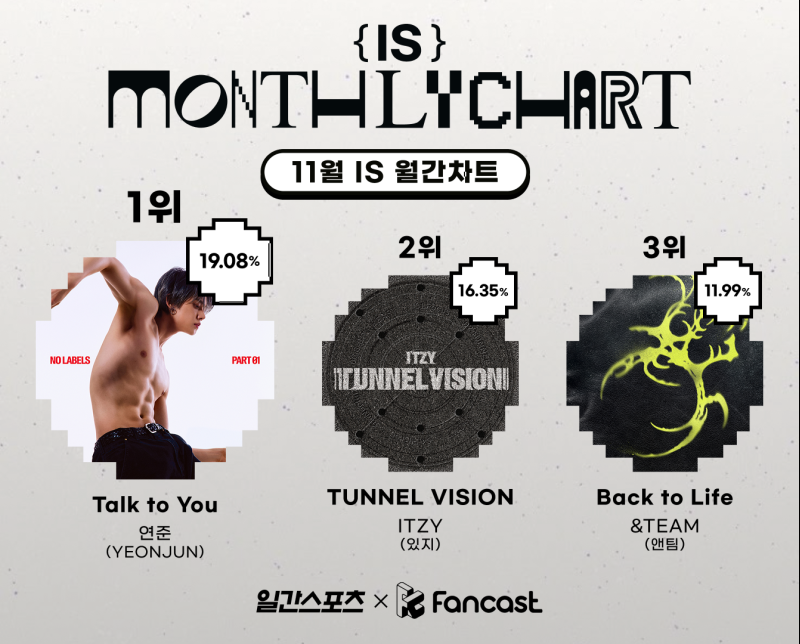이번 ‘IS 월간 차트’ 1위를 거머쥔 연준의 ‘톡 투 유’는 매력적인 퍼포먼스와 감각적인 음악 스타일로 국내외 팬들의 폭넓은 사랑을 받고 있다. 섬세한 보컬과 몰입감 있는 표현력, 강렬한 비주얼 퍼포먼스가 어우러지며, 솔로 아티스트로서 존재감을 확실히 각인시켰다는 평가다.